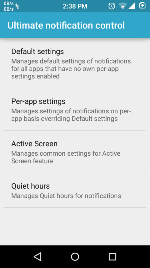 nah disini saya menggunakan gravity box v 5.0.5 alpha untuk android 5.0.2 dan seperti ini lah fitur ultimate notification control. disini kita dapat mengatur aplikasi default, pengaturan di setiap aplikasi, layar aktif dan waktu tenang.